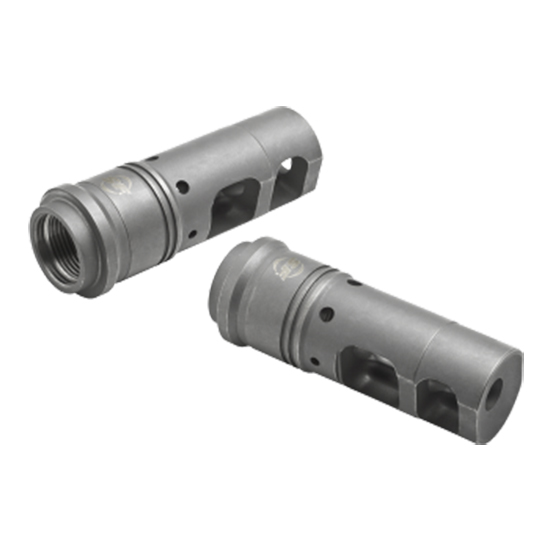 Caliber: 5.56 mm (.223 caliber) – Length: 2.70 inches – Offset porting delivers greatly reduced recoil impulse and muzzle rise so the weapon tracks straight back to keep you on target for faster shot-to-shot recovery – Multiple bearing surfaces for superior suppressor alignment – Precision machined from US mill-certified heat-treated stainless steel bar stock – High-precision single-point cut barrel threads for optimum thread interface – Inspected for all critical dimensions including concentricity and alignment – Pilot holes for tuning of muzzle brake and to pin-and-weld on short-barreled rifles – Black Ionbond DLC coating provides maximum protection against harsh environmental conditions and facilitates cleaning after extreme use – Serves as rock-solid mounting adapter for SureFire SOCOM Series sound suppressors – Labyrinth seals prevent carbon buildup on suppressor lock ring indexing system – Installation requires no permanent modifications for M4 / M16 / AR15 type weapons